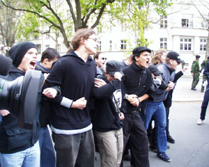 Etwa 20 Gegendemonstranten nach dem Durchbruch der Polizeisperren