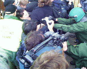 "Anti-Konflikt-Teams zurückziehen!" Die Männer fürs Grobe übernehmen das Abdrängen der NPD-Gegner.